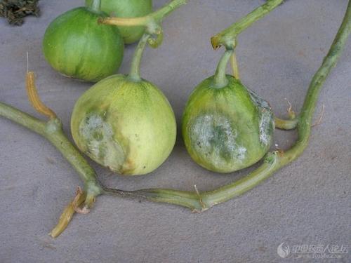 根莖部染病,初始產(chǎn)生暗綠色水漬狀病斑,病斑迅速擴展、莖呈軟腐狀,有時長達(dá)10厘米以上,植株萎蔫、青枯而死亡,但維管束不變色。幼苗染病,多始于嫩尖,產(chǎn)生水漬狀病斑,病情發(fā)展較快,萎蔫枯死,但不倒伏。葉片染病,初始產(chǎn)生暗綠色水浸狀斑點,擴展為近圓型或不規(guī)則大型的黃褐色病斑;天氣潮濕時全葉腐爛,并產(chǎn)生白色霉層;干燥時病斑極易破裂。莖染病,多在近地面莖基部開始,初始呈暗綠色水漬狀斑病部縊縮,成株期往往有幾處節(jié)受害,俗稱“節(jié)節(jié)爛”。南瓜果實染病,初始出現(xiàn)水漬狀淺褐色小斑,潮濕時病斑凹陷,并長出一層稀疏的白色霉?fàn)钗铮床【逆吣夜:玩咦幽遥?,以后軟化腐爛,迅速向各方向擴展,在病部產(chǎn)生白色霉層,最終導(dǎo)致病瓜局部或全部腐爛。發(fā)生特點此病由真菌鞭毛菌亞門甜瓜疫霉侵染引起。病菌以菌絲體、卵孢子和厚垣孢子隨病殘體在土中越冬。翌年春通過風(fēng)雨、灌溉水傳播。病菌發(fā)育的適宜溫度范圍很廣,在5——37℃之間,最適溫度為28——30℃,高濕是發(fā)病的決定性因素。雷雨過后,田間積水不能及時排出易誘發(fā)此病。多雨季節(jié)發(fā)病重,大雨過后暴晴最易發(fā)病流行。連作地、排水不良、澆水過多、施用未腐熟欄肥、通風(fēng)透光差的田塊發(fā)病較重。目前沅江市茶盤洲、泗湖山、共華等種植重點鄉(xiāng)鎮(zhèn)進入了發(fā)病盛期。防治要點①實行非瓜類作物輪作3年以上,采用地膜覆蓋栽培,深溝高畦種植,施用充分腐熟有機欄肥。②種子處理:可用72.2%普力克水劑600倍液或64%殺毒礬可濕性粉劑800倍液浸種30分鐘后催芽。③選擇地勢高燥、排水良好的田塊,注意控制澆水次數(shù),雨后及時排水,加強通風(fēng)換氣,發(fā)現(xiàn)中心病株,及時拔除并銷毀。④藥劑防治:于發(fā)病初期選用50%安克可濕性粉劑2500倍液,25%阿米西達(dá)懸浮劑1000——1500倍液,或69%金雷水分散粒劑600——800倍液,或72.2%普力克水溶性液劑800倍液,或70%品潤干懸浮劑500倍液,或72%克露可濕性粉劑800倍液,或52.5%抑快凈水分散劑3000倍液,或72.2%霜霉威水劑500倍液,或47%加瑞農(nóng)可濕性粉劑800倍液,或64%殺毒礬可濕性粉劑1000倍液等噴霧,每隔7——10天1次,連續(xù)防治3——4次。